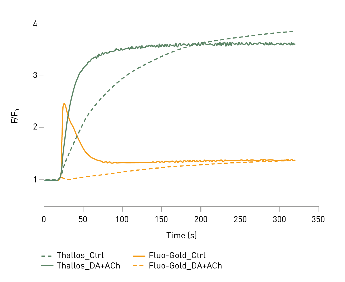 Additional validation tests showed the specifi city of detection of the Ca2+ and Tl+ signaling pathways (data not shown). Figure 3 shows the simultaneous detection of acetylcholine stimulated Ca2+ release via Fluo-Gold and dopamine-mediated activation of a GIRK channel via Thallos fluorescence. Both dyes were suitable for the multiplex approach.