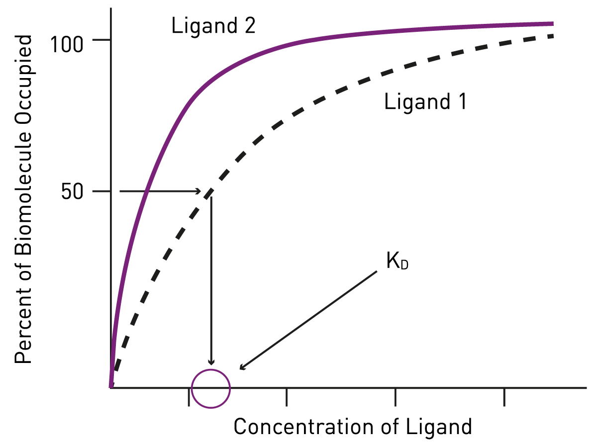 Affinity is measured and reported using the equilibrium dissociation constant (KD), which refers to the concentration of a ligand at equilibrium when half its binding sites are occupied. For these measurements, the ligand should be present at a concentration in excess of the target. The dissociation constant for this type of process is denoted as KD.