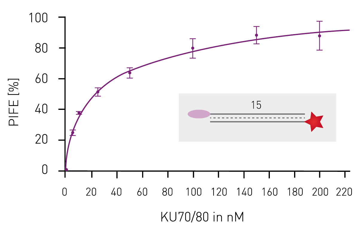 While protein-protein interactions are widespread in biological systems, interactions between biomolecules are incredibly diverse. For example, proteins may also interact directly with other biomolecules like nucleic acids. In the application note AN312 Protein-induced fluorescence enhancement detects protein-nucleic acid interactions in microplates, a fluorescence assay (protein-induced fluorescent enhancement assay) was used to study the interaction of the DNA repair protein Ku with biologically relevant oligonucleotides on the Omega series microplate reader. This protein-induced fluorescent enhancement assay is a straightforward and high throughput method that does not require protein labeling and can be applied to a wide range of protein-nucleic acid interactions.7 Using this method, the calculated KD for Ku/DNA interaction was 10 ± 5 nM, which is within the range previously determined by other experimental approaches. 7 In addition to protein-nucleic acid dissociation constants (Fig. 3), this fluorescence approach can be used to look at sequence and structure binding specificities, detection of weak interactions, and the ability of a protein to translocate along DNA.