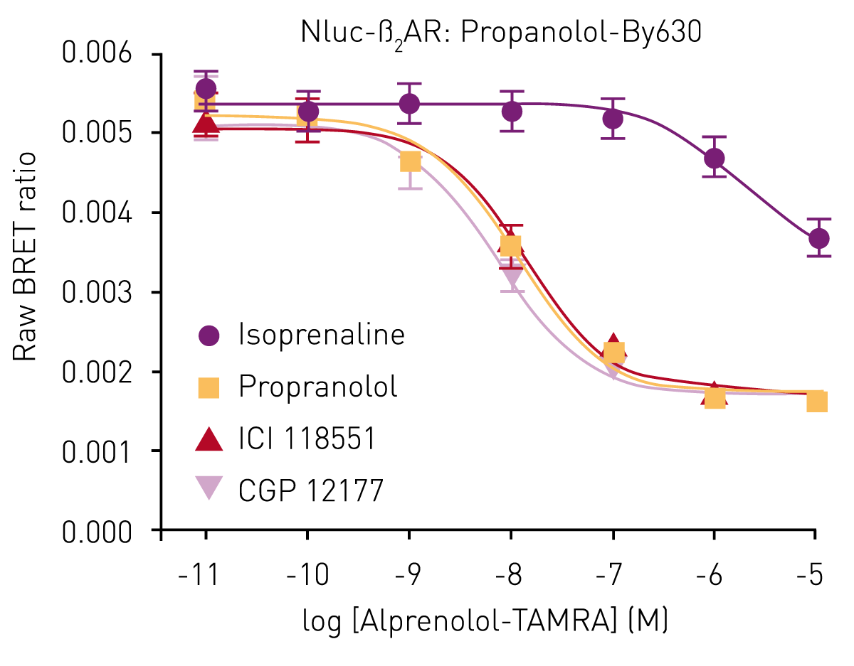 In the application note AN287 NanoBRET™ assay for monitoring of ligand binding to GPCRs in live cells, using the CLARIOstar® and the PHERAstar® FSX a luminescence-based NanoBRET assay was used in competitive binding experiments to calculate binding affinities (KD values) for ligands to GPCRs in live cells.9 The donor luciferase NanoLuc was used in a nonradioactive, proximity-based interaction assay for this purpose. A GPCR was expressed in live HEK293 cells with NanoLuc luciferase at the N-terminus. The receptor ligand was labelled with a different fluorophore whose excitation spectrum overlapped the emission spectrum of NanoLuc. When the ligand was not bound to the receptor, only the blue emission of NanoLuc was detected. In contrast, when the ligand was bound to the receptor, red fluorescence was detected due to excitation of the fluorescence label by resonance energy transfer. This experimental system permitted accurate determination of binding affinities for a cell-based GPCR assay.