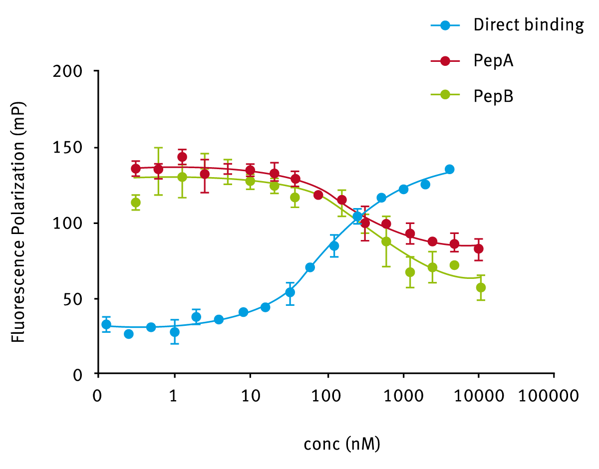 In the application note AN256 Protein-ligand binding measurements using fluorescence polarization binding affinities (KD values) were determined from competitive binding assays with a multiprotein complex of human Lys-specific Histone Demethylase 1 (LC1 complex), an enzyme involved in chromatin remodeling. The binding interaction to a heterodimer of this enzyme was studied using TAMRA (5-carboxytetramethylrhodamine) fluorescently labeled histone peptides using fluorescence polarization measurements on both the CLARIOstar and PHERAstar (Fig. 5). Dissociation constants were also determined from direct binding experiments. Experiments with different peptide ligands generated KD values in the range 76.4 ± 10.4 nM to 316.6 ± 59.9 nM.